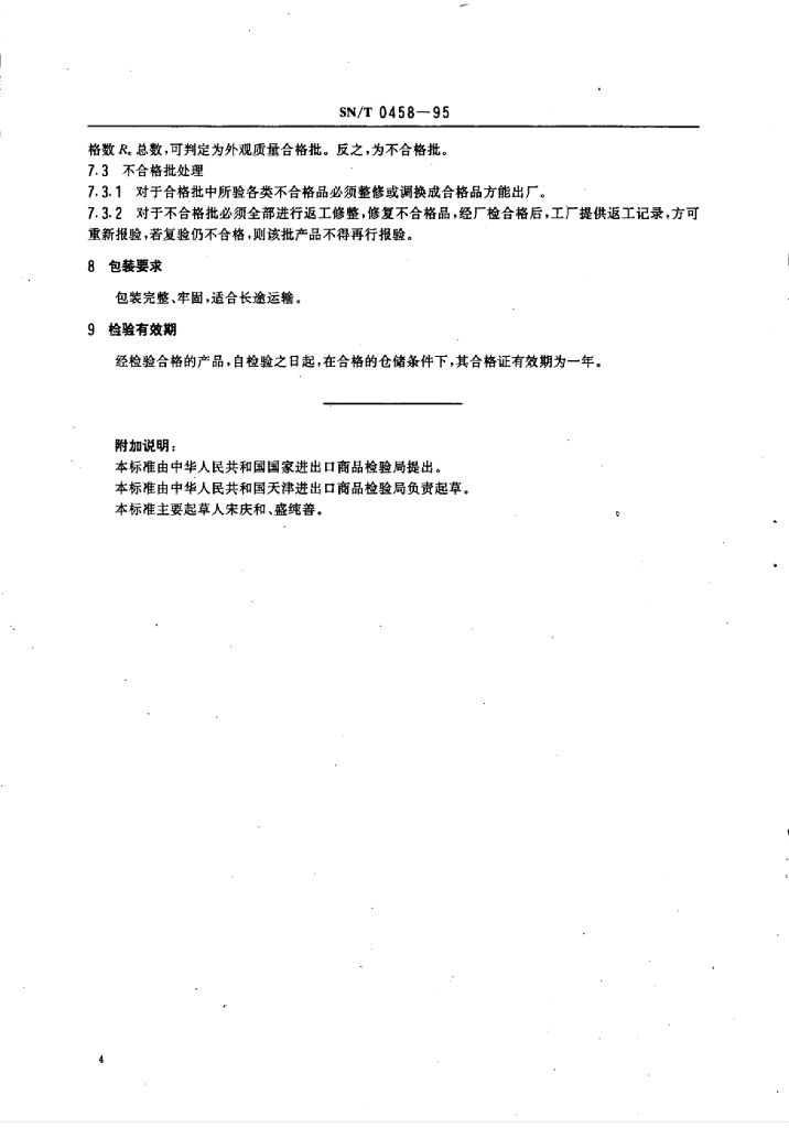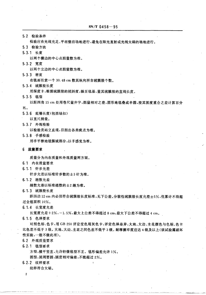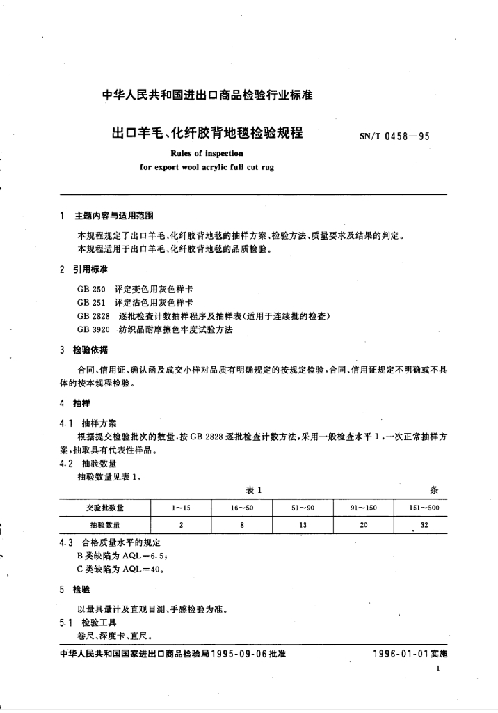 SN/T 0458-1995 出口羊毛、化纤胶背地毯检验规程