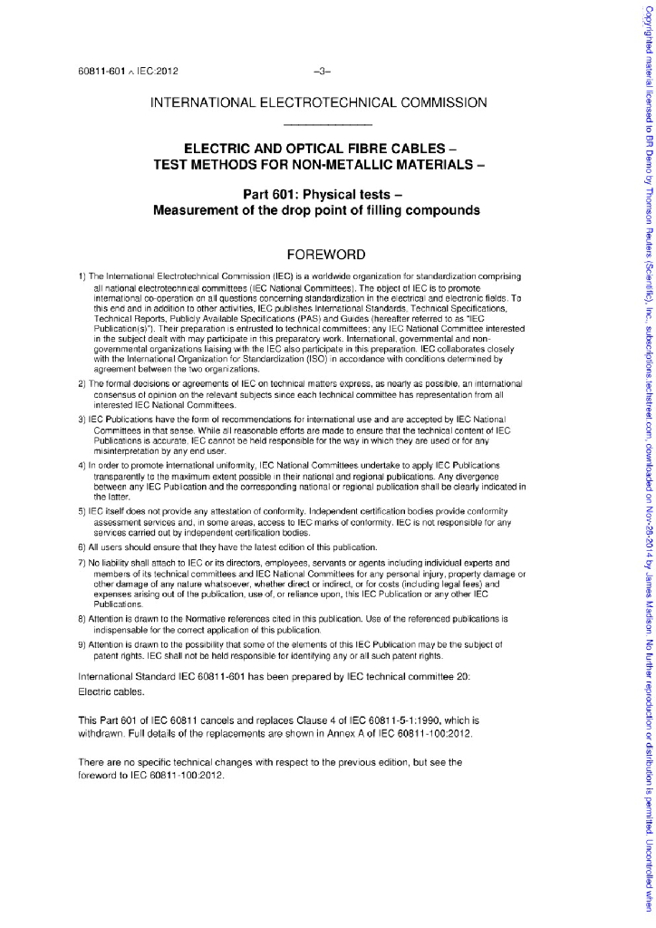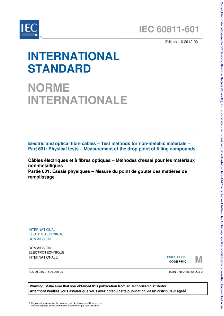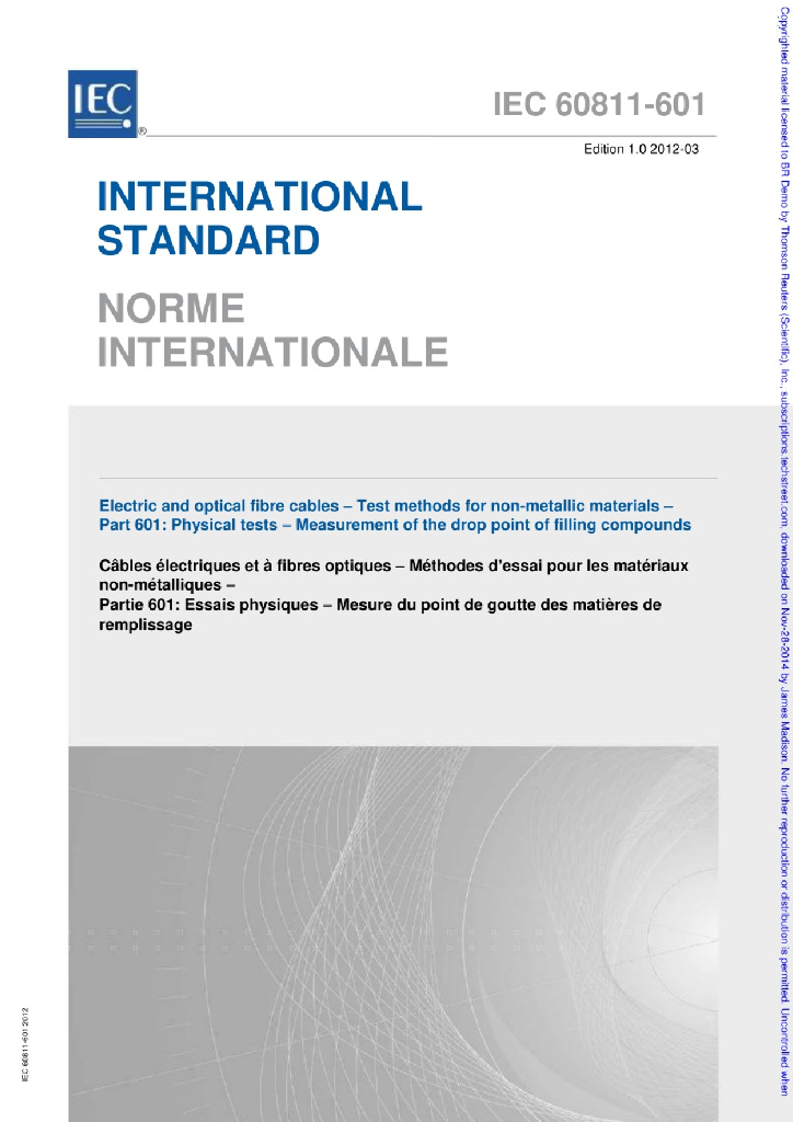 IEC 60811-601:2012 电缆和光缆-非金属材料的试验方法 第601部分:物理试验-填充化合物的滴点测量