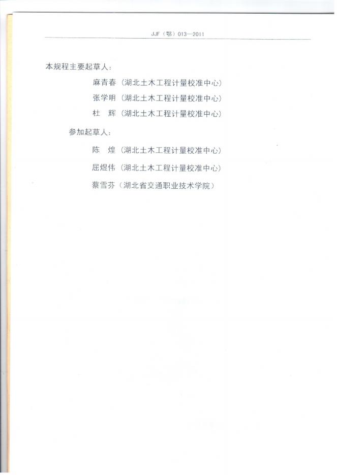 麻青春(湖北土木工程计量校准中心)、张学明(湖北土木工程计量校准中心)、杜辉(湖北土木工程计量校准中心)、陈煌(湖北土木工程计量校准中心)、屈煜伟(湖北土木工程计量校准中心)、蔡雪芬(湖北省交通职业技术学院)