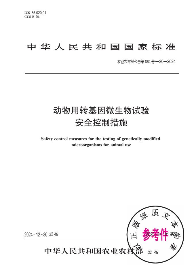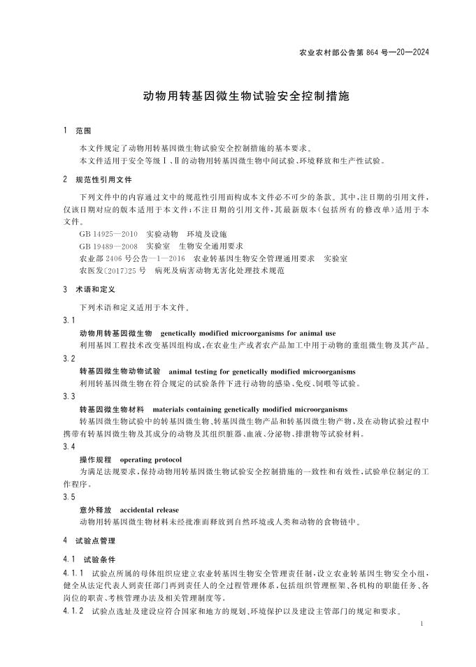 农业农村部公告 第864号-20-2024 动物用转基因微生物试验安全控制措施