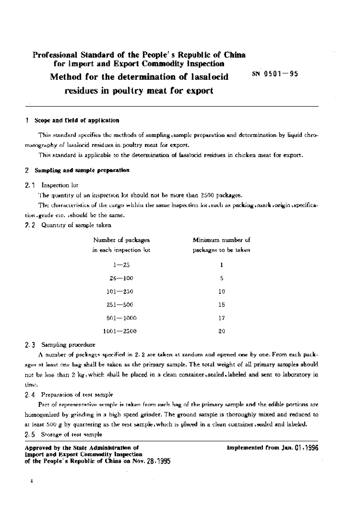 SN 0501-1995 出口禽肉中拉沙里菌素残留量检验方法
