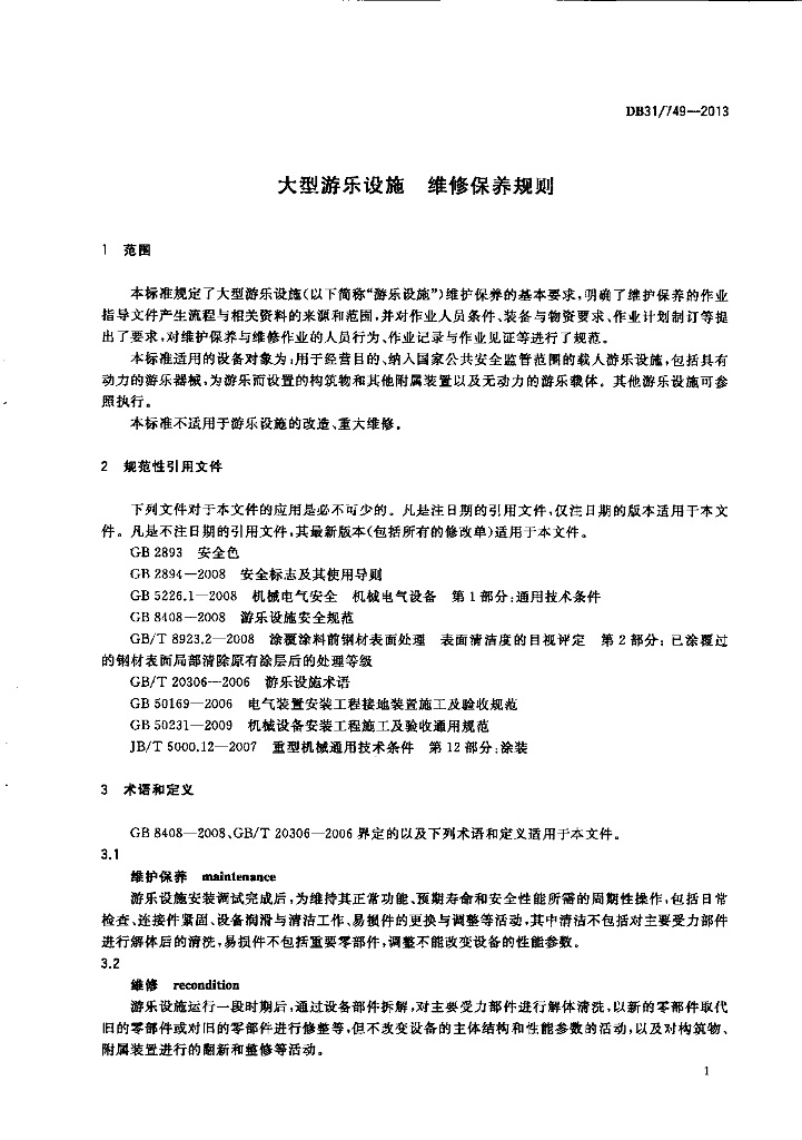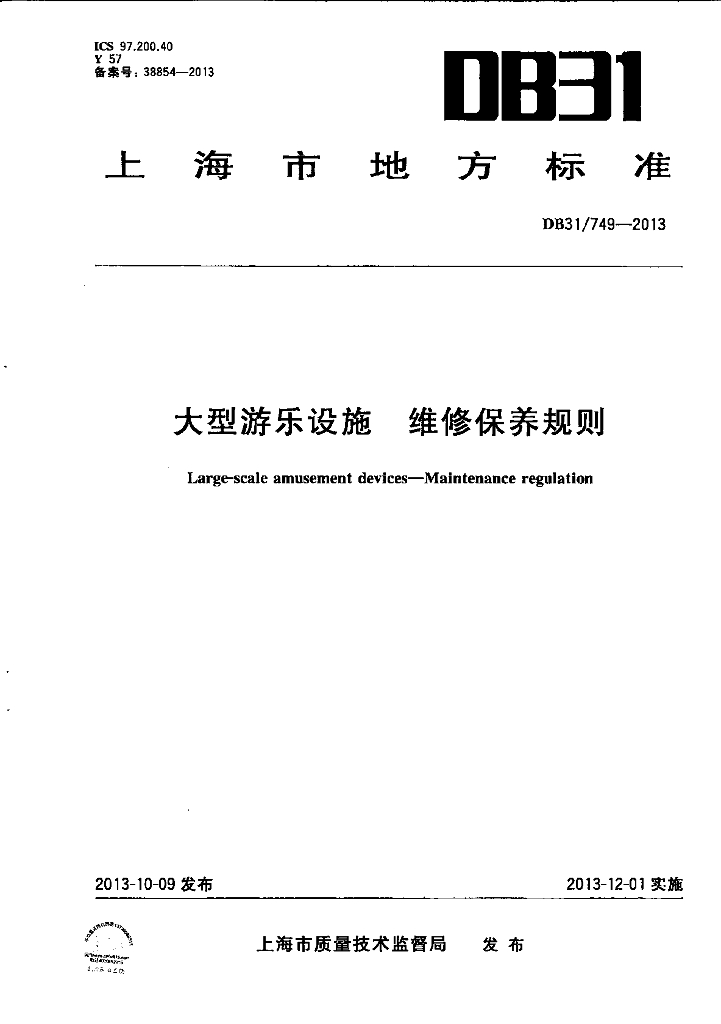 DB31/T 749-2013 大型游乐设施 维修保养规则