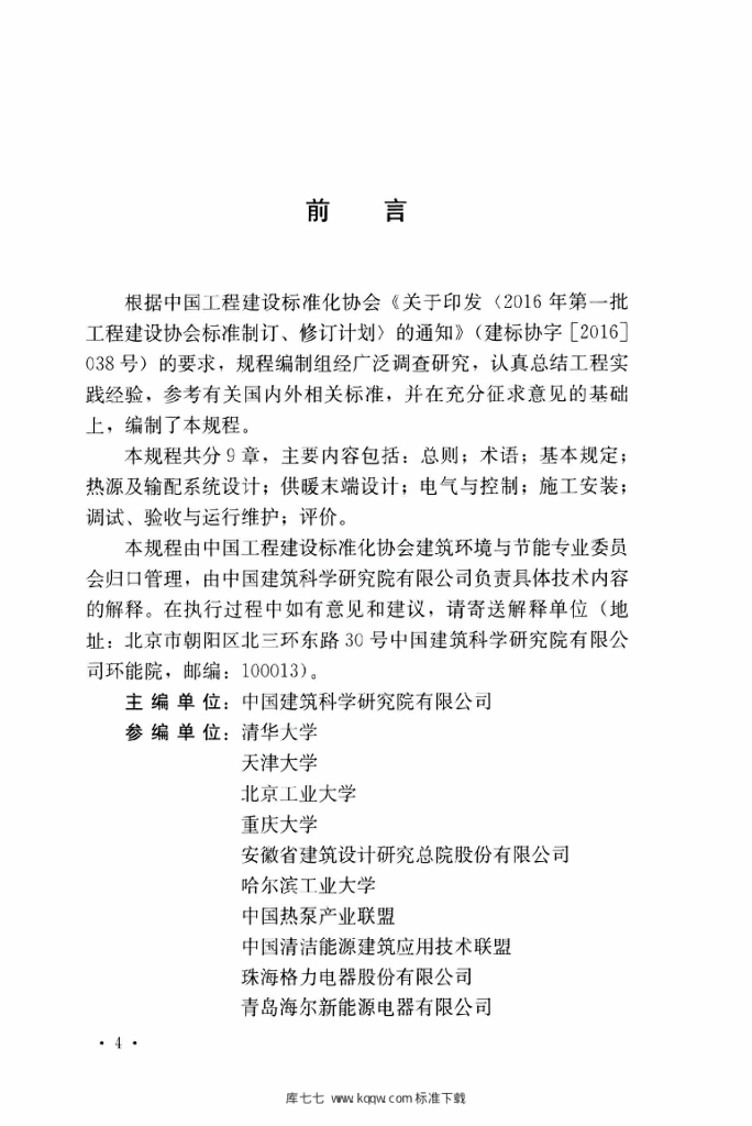 中国建筑科学研究院有限公司清华大学 天津大学 北京工业大学 重庆大学 安徽省建筑设计研究院有限责任公司 哈尔滨工业大学 中国热泵产业联盟 中国清洁能源建筑应用技术联盟 珠海格力电器股份有限公司 青岛海尔新能源电器有限公司 艾默生环境优化技术(苏州)有限公司 广东美的暖通设备有限公司 恒有源科技发展集团有限公司 江苏辛普森新能源有限公司 山东阿尔普尔节能装备有限公司 广东热立方热泵系统有限公司 广东美格动力新能源有限公司 格兰富水泵(上海)有限公司 浙江正理生能科技有限公司 北京四季沐歌太阳能技术集团有限公