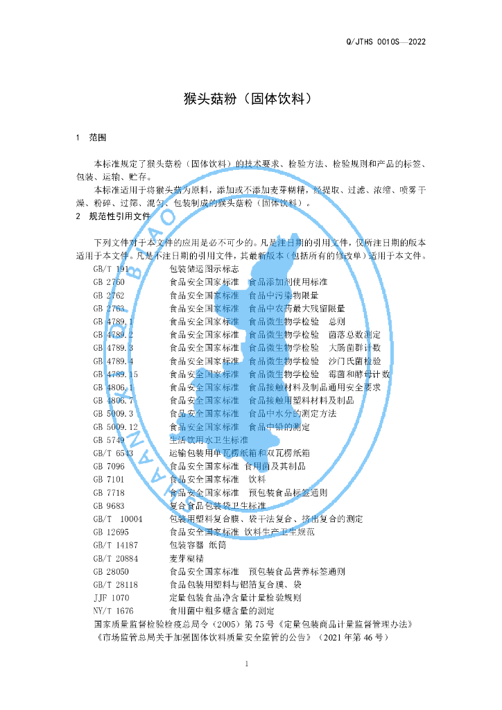 Q/JTHS 0010S-2022 猴头菇粉(固体饮料)