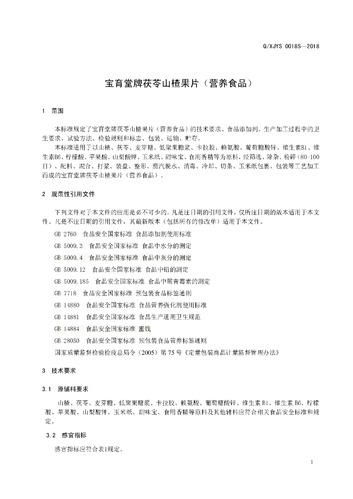 Q/XJYS 0018S-2018 宝育堂牌茯苓山楂果片(营养食品)