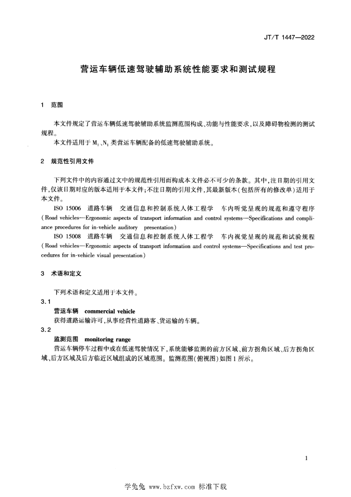 JT/T 1447-2022 营运车辆低速驾驶辅助系统性能要求和测试规程