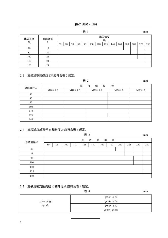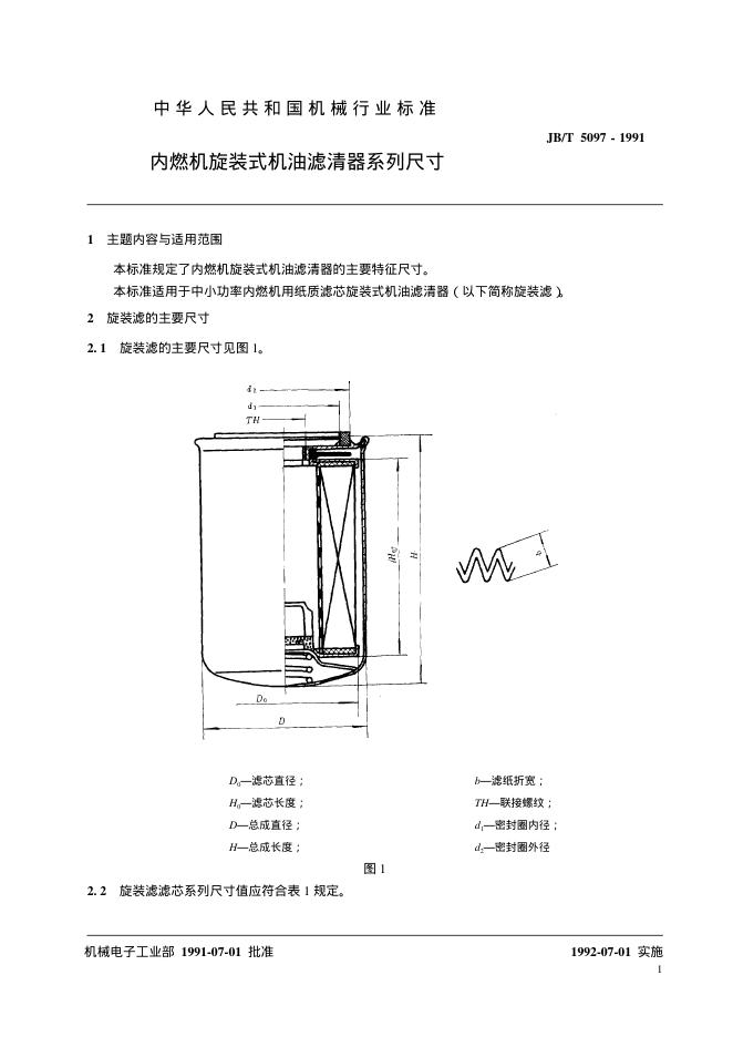 JB/T 5097-1991 内燃机旋装式机油滤清器 系列尺寸