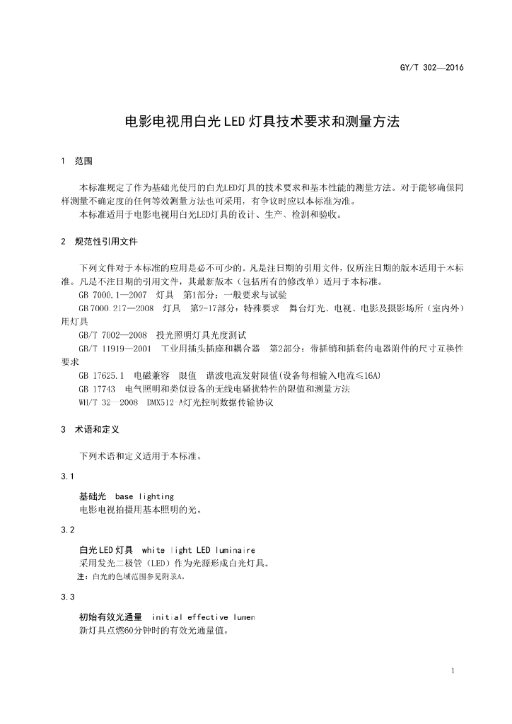 GY/T 302-2016 电影电视用白光LED灯具技术要求和测量方法