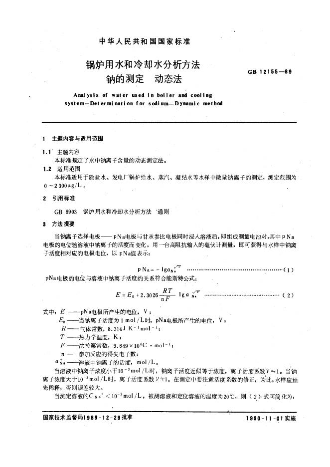 GB/T 12155-1989 锅炉用水和冷却水分析方法 钠的测定 动态法
