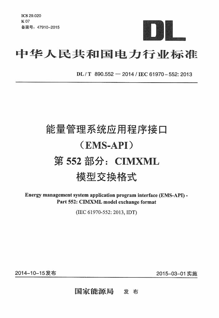 DL/T 890.552-2014 能量管理系统应用程序接口 ( EMIS-API ) 第552部分:CIMXML 模型交换格式