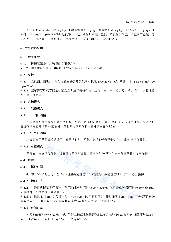 DB6543/T 003-2024 青贮玉米栽培技术规程