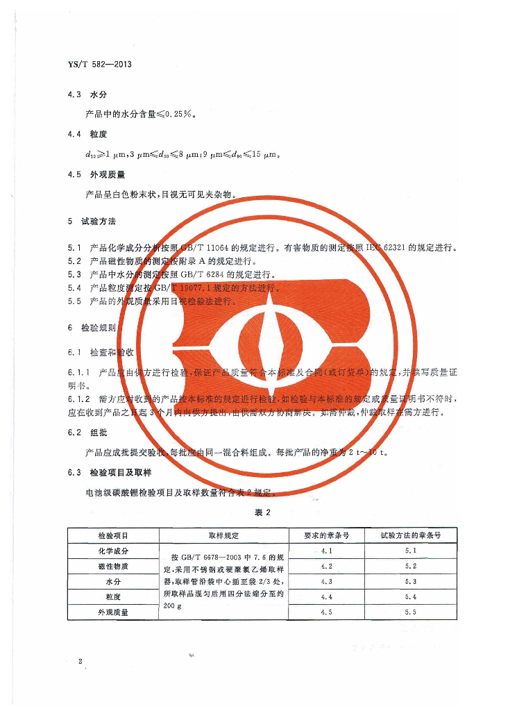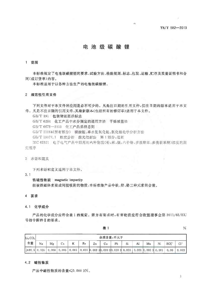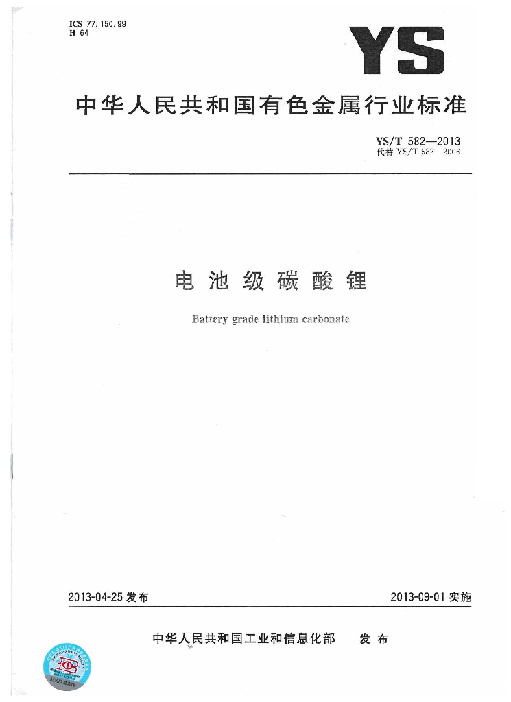 YS/T 582-2013 电池级碳酸锂