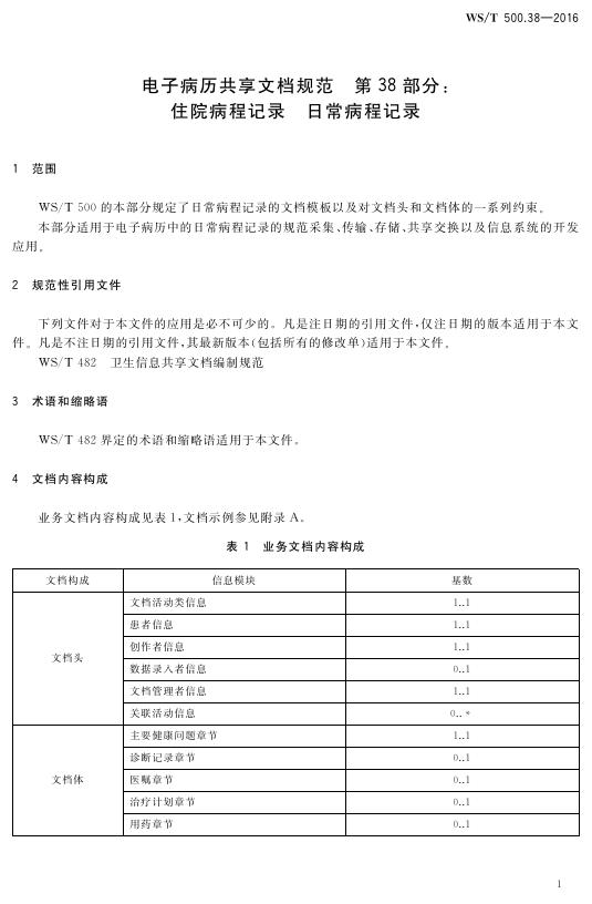 WS/T 500.38-2016 电子病历共享文档规范 第38部分:住院病程记录日常病程记录
