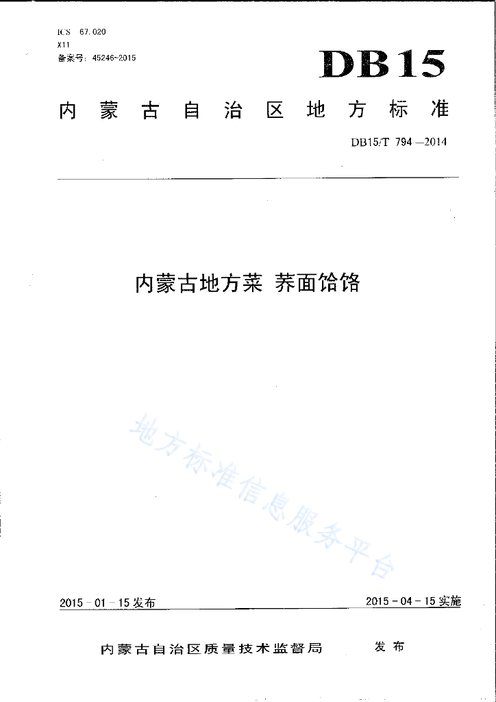 DB15/T 794-2014 内蒙古地方菜 荞面饸饹