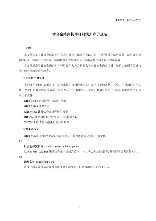 T/CWAN 0195-2026 钛合金蜂窝构件钎缝缺欠评价规范