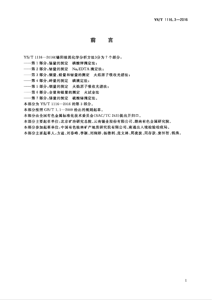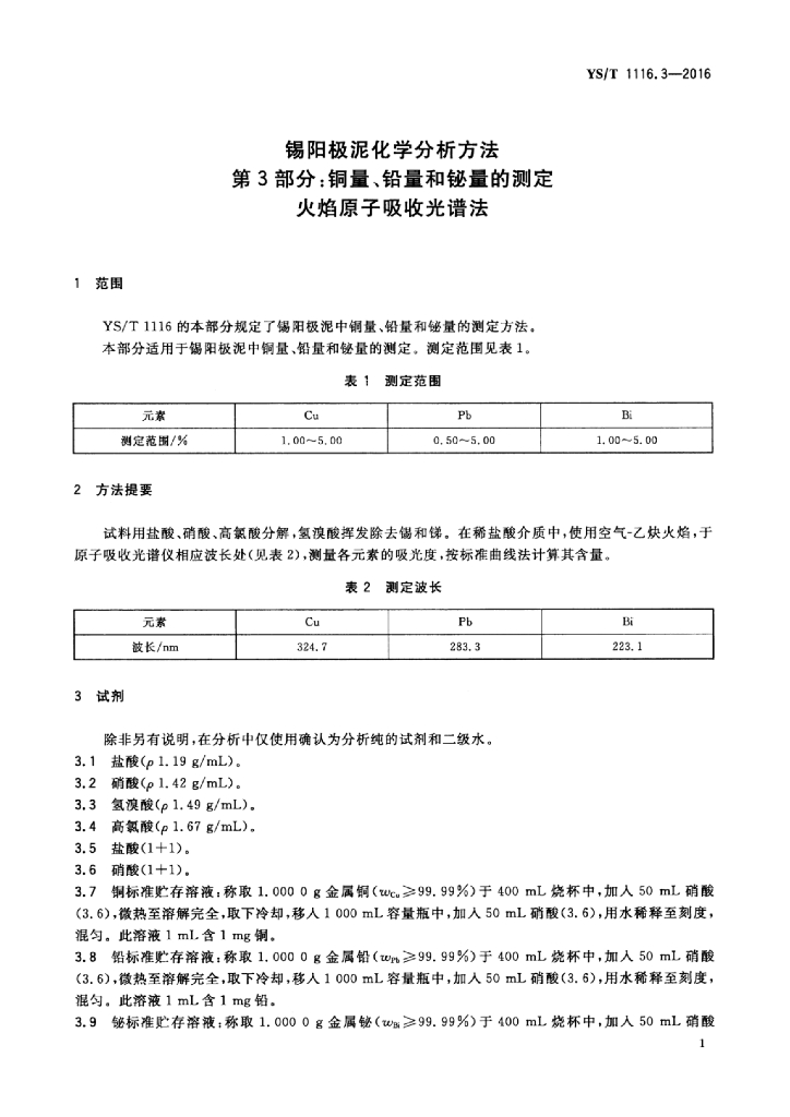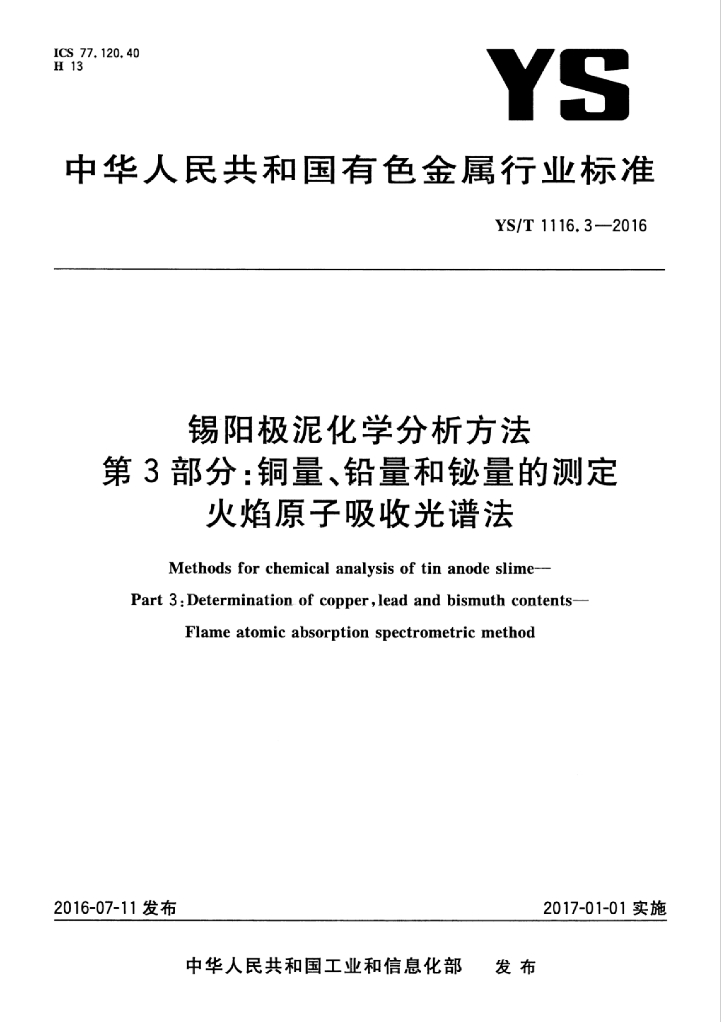 YS/T 1116.3-2016 锡阳极泥化学分析方法 第3部分:铜量、铅量和铋量的测定 火焰原子吸收光谱法