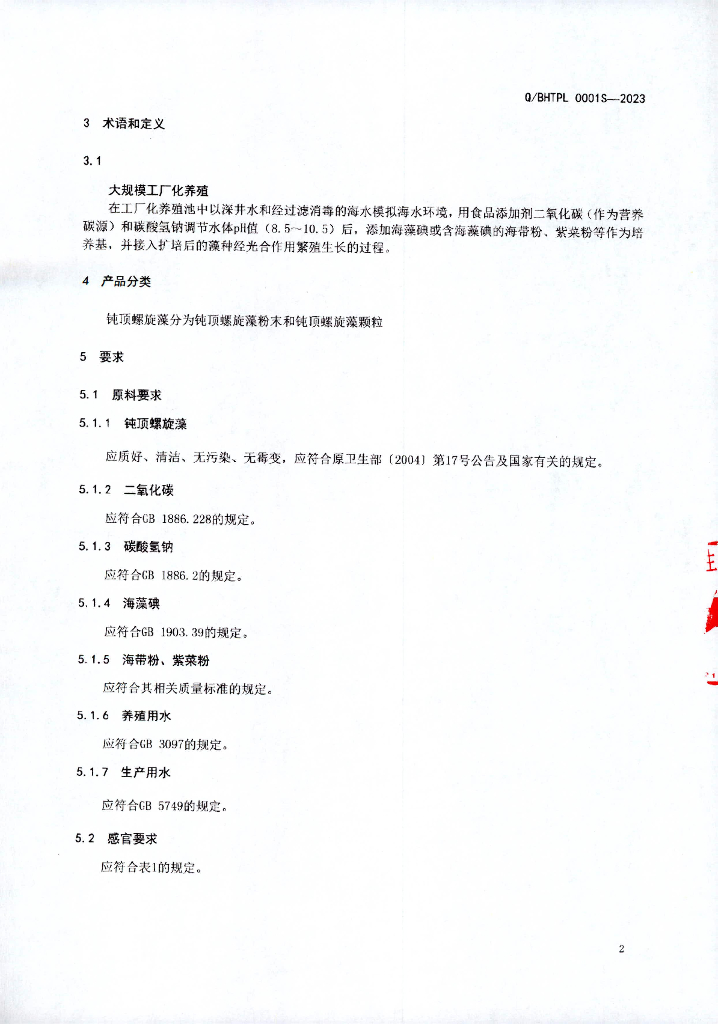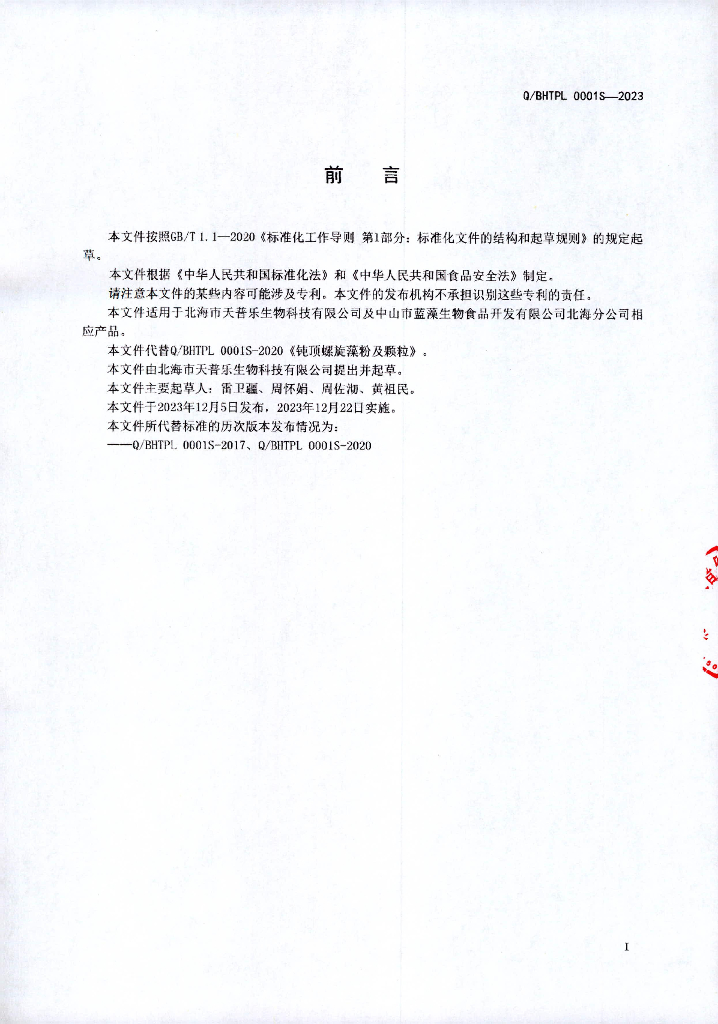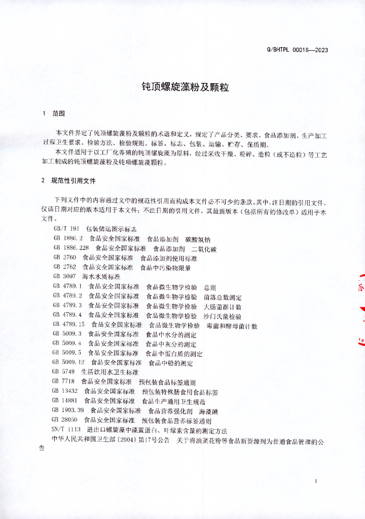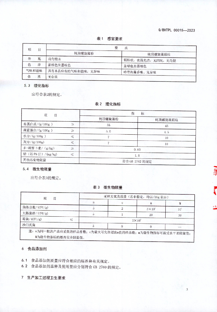 Q/BHTPL 0001S-2023 钝顶螺旋藻粉及颗粒