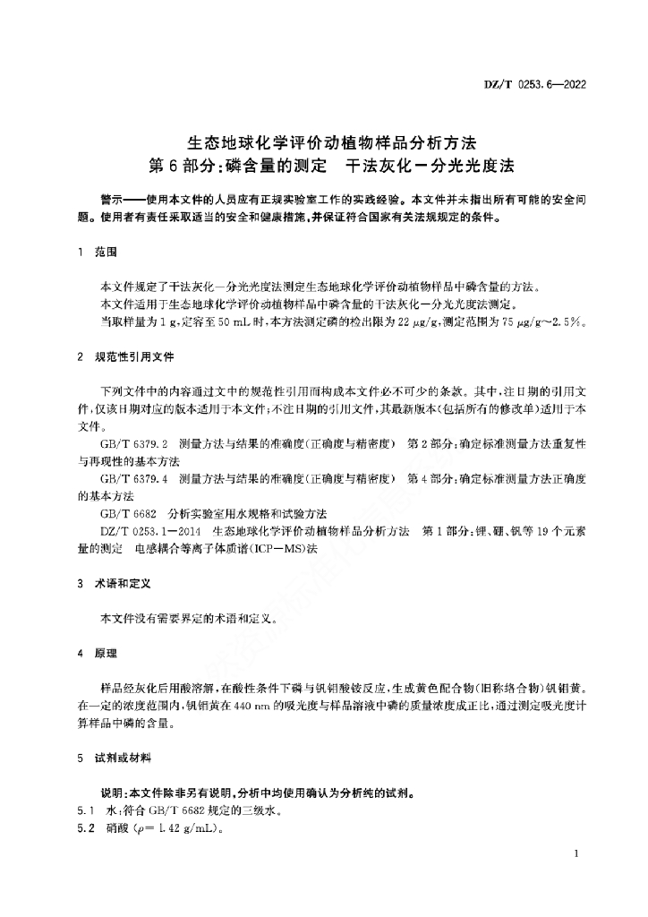 DZ/T 0253.6-2022 生态地球化学评价动植物样品分析方法 第6部分:磷含量的测定 干法灰化-分光光度法