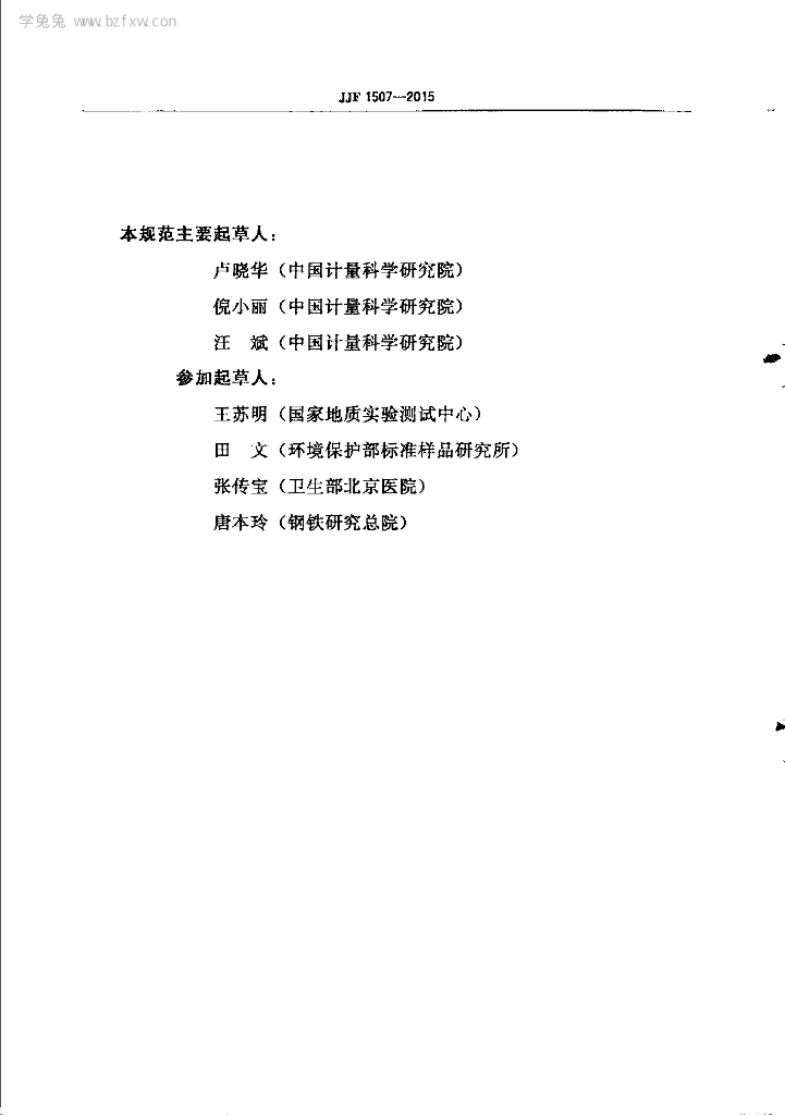 卢晓华(中国计量科学研究院)、倪小丽(中国计量科学研究院)、汪斌(中国计量科学研究院)、王苏明(国家地质实验测试中心)、田文(环境保护部标准样品研究所)、张传宝(卫生部北京医院)、唐本玲(钢铁研究总院)