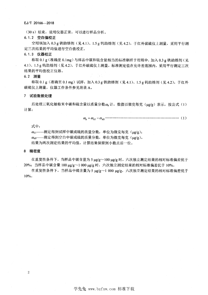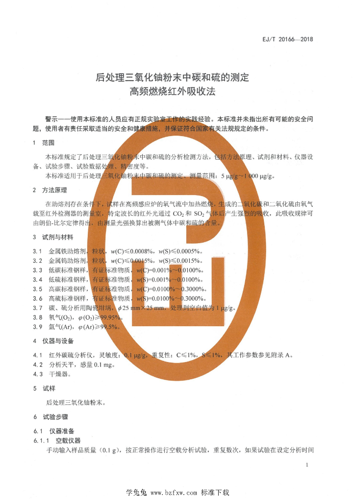 EJ/T 20166-2018 后处理三氧化铀粉末中碳和硫的测定 高频燃烧红外吸收法