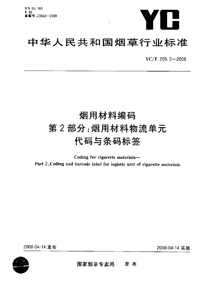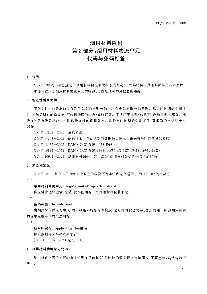 YC/T 209.2-2008 烟用材料编码 第2部分:烟用材料物流单元代码与条码标签