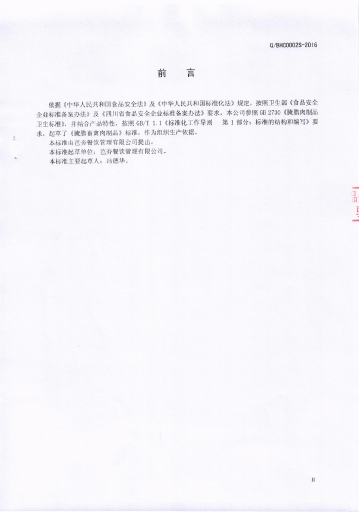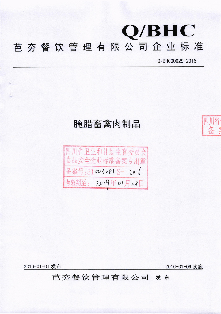 Q/BHC 0002S-2016 芭夯餐饮管理有限公司 腌腊畜禽肉制品