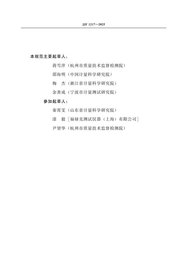 蒋雪萍(杭州市质量技术监督检测院)、邵海明(中国计量科学研究院)、梅杰(浙江省计量科学研究院)、余善成(宁波市计量测试研究院)、秦霄雯(山东省计量科学研究院)、漆毅[福禄克测试仪器(上海)有限公司]、尹望华(杭州市质量技术监督检测院)
