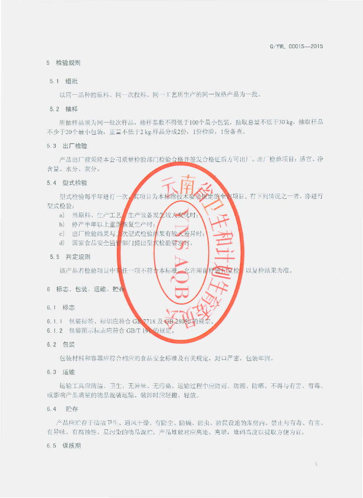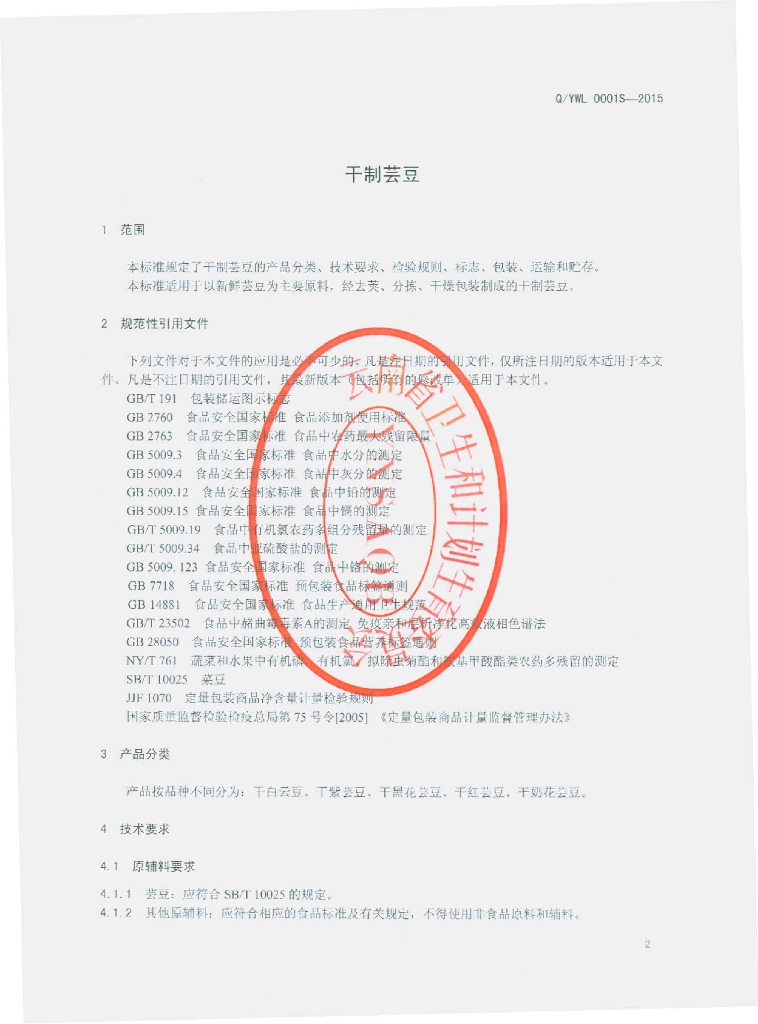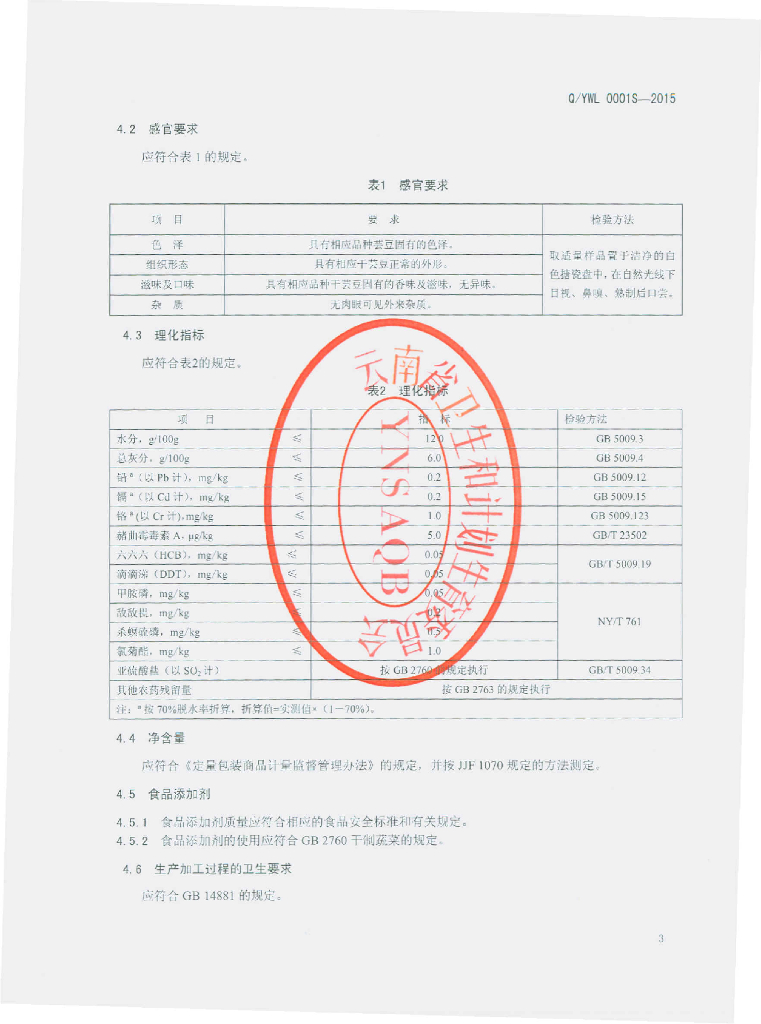 Q/YWL 0001S-2015 云南万力贸易有限公司 干制芸豆