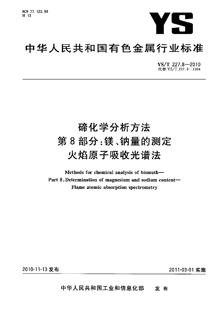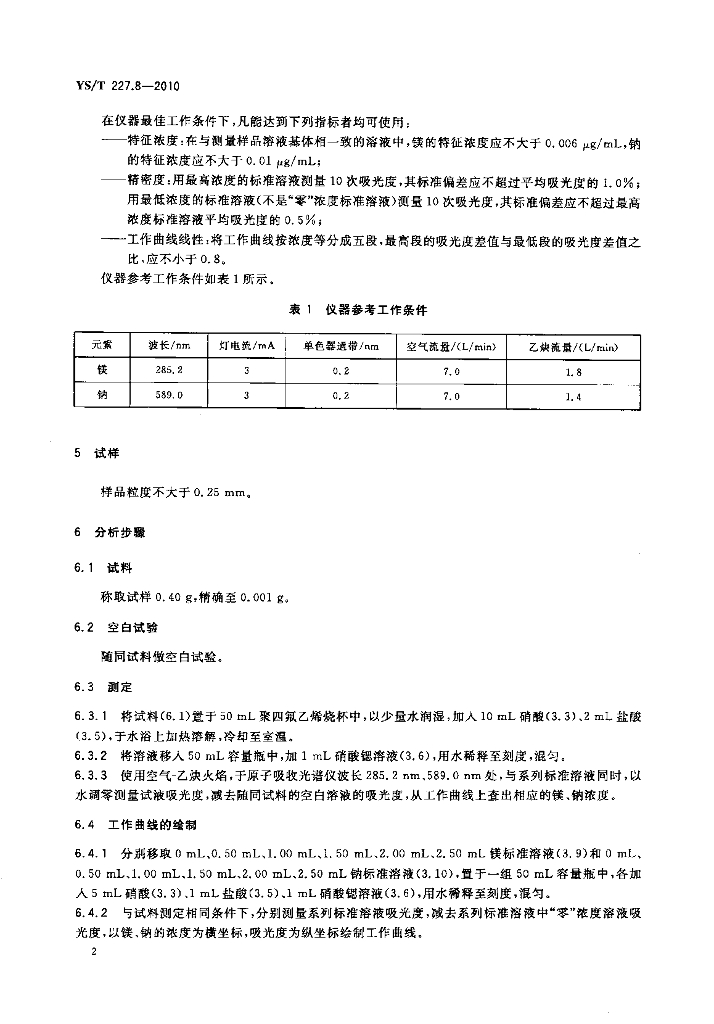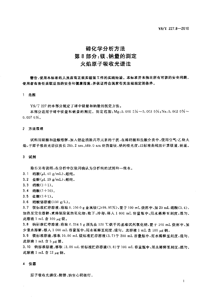 YS/T 227.8-2010 碲化学分析方法 第8部分:镁、钠量的测定 火焰原子吸收光谱法