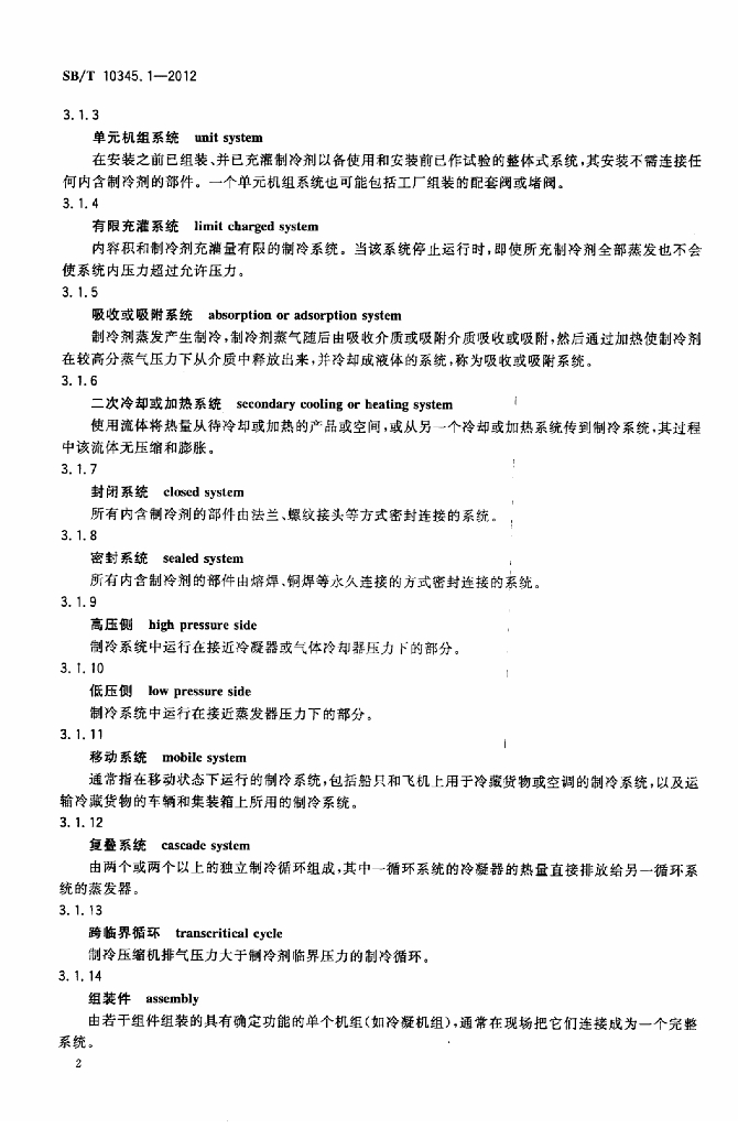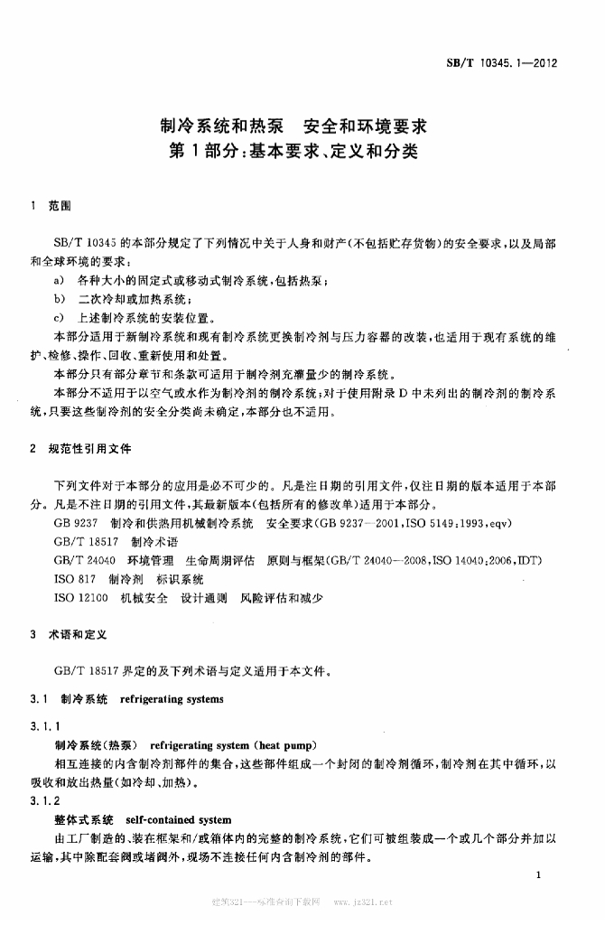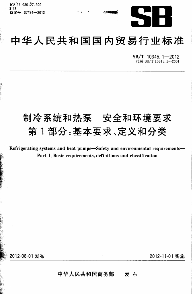 SB/T 10345.1-2012 制冷系统和热泵 安全和环境要求 第1部分:基本要求、定义和分类