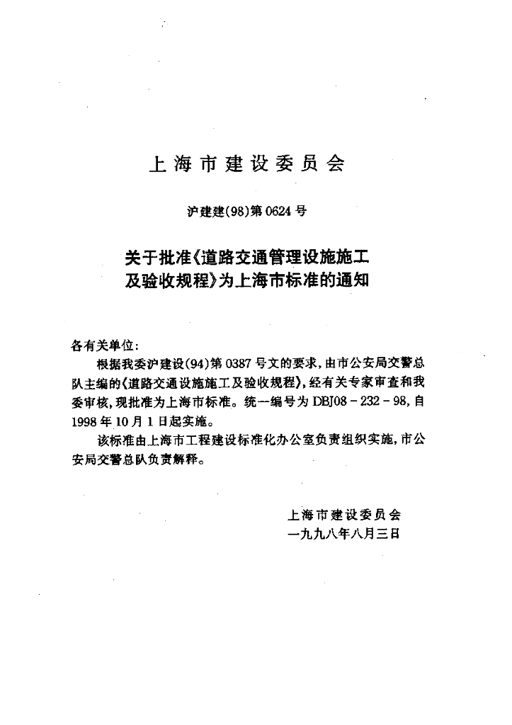 DBJ08-232-98 道路交通管理设施施工验收规程
