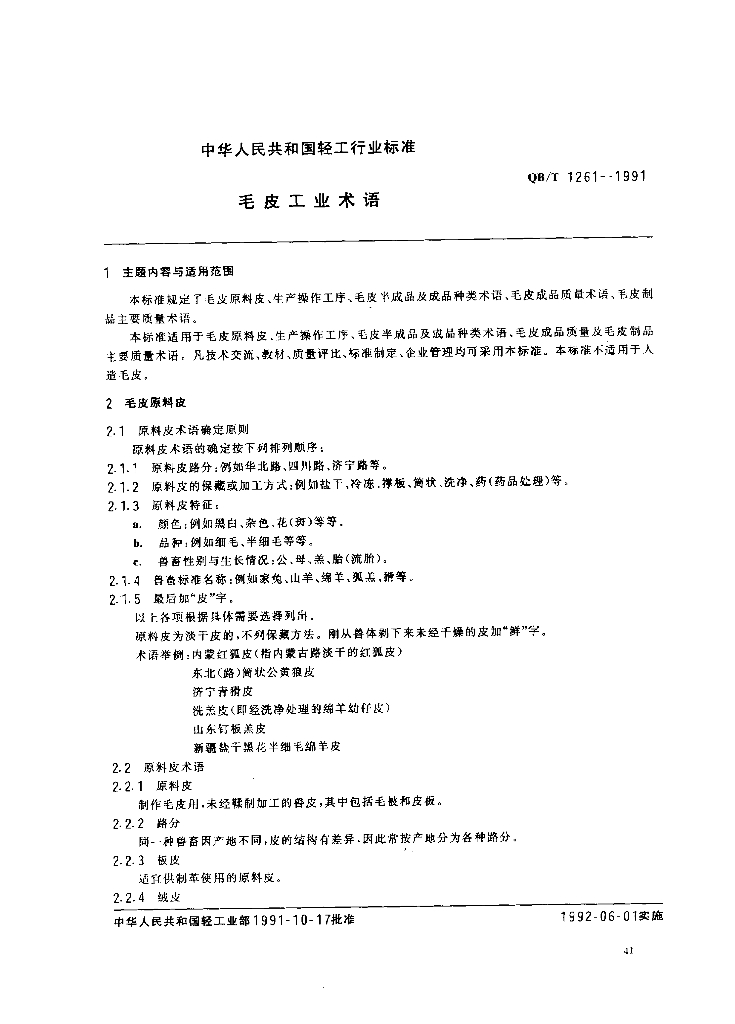 QB/T 1261-1991 毛皮工业术语