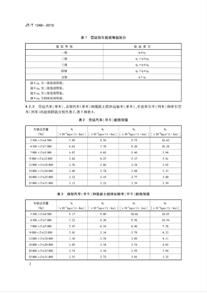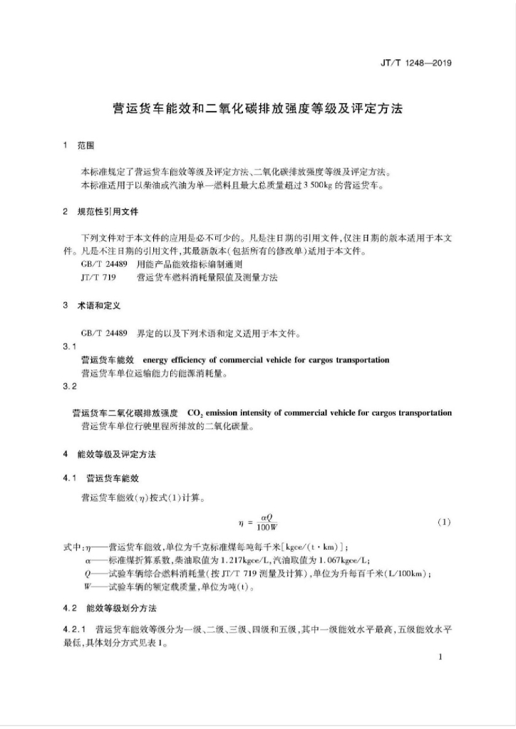 JT/T 1248-2019 营运货车能效和二氧化碳排放强度等级及评定方法