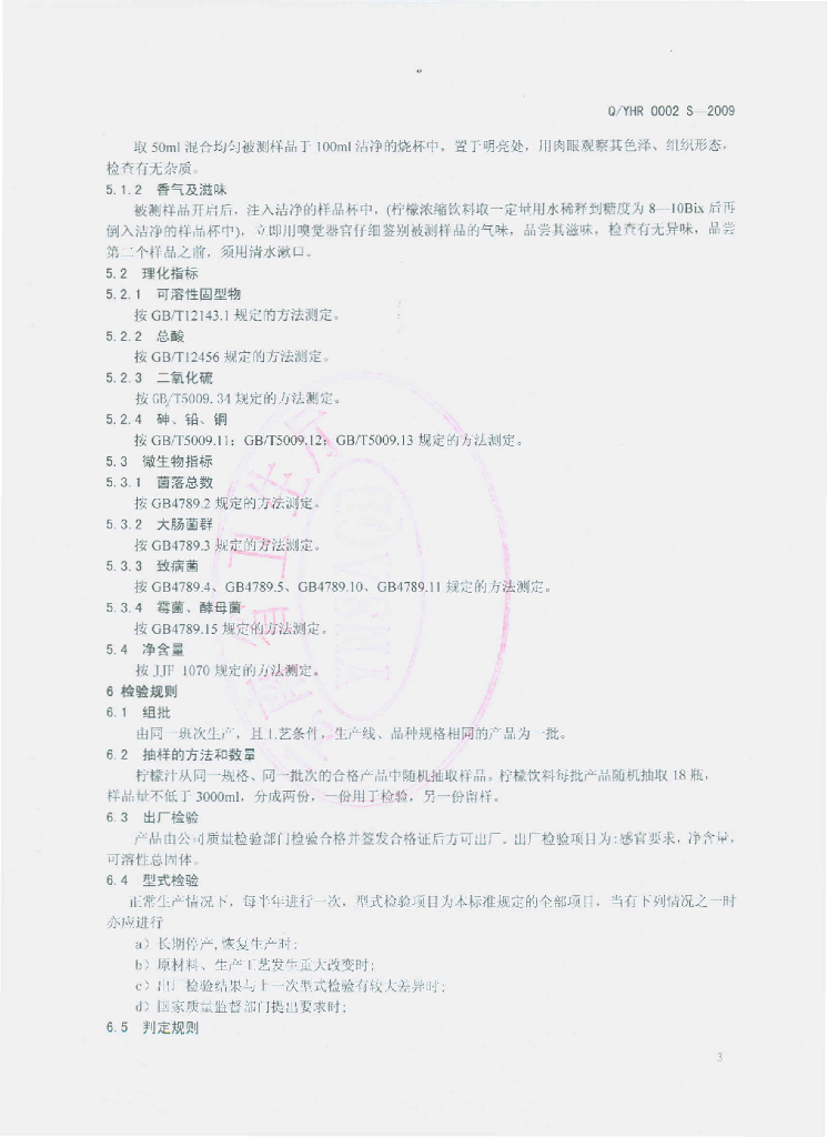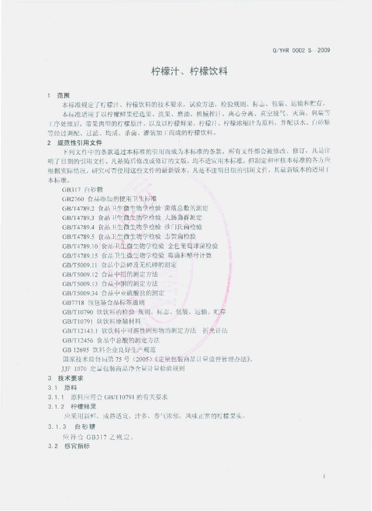 Q/YHR 0002S-2009 柠檬汁、柠檬饮料