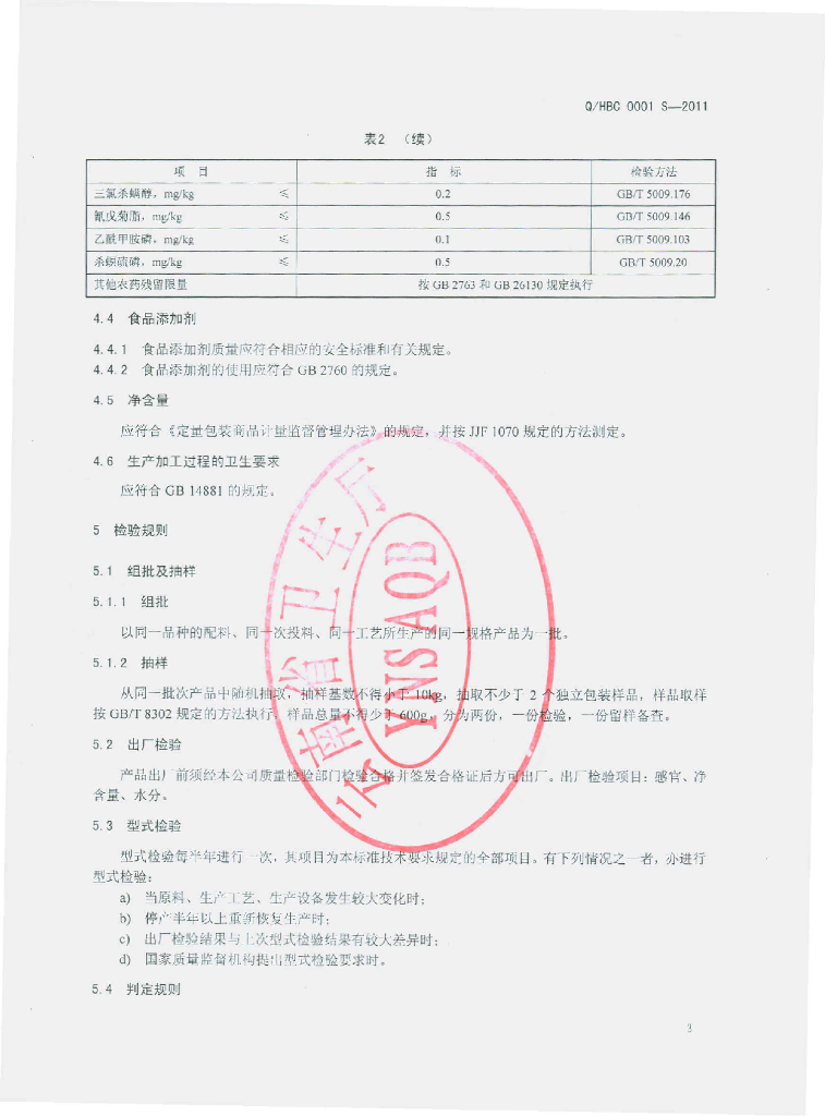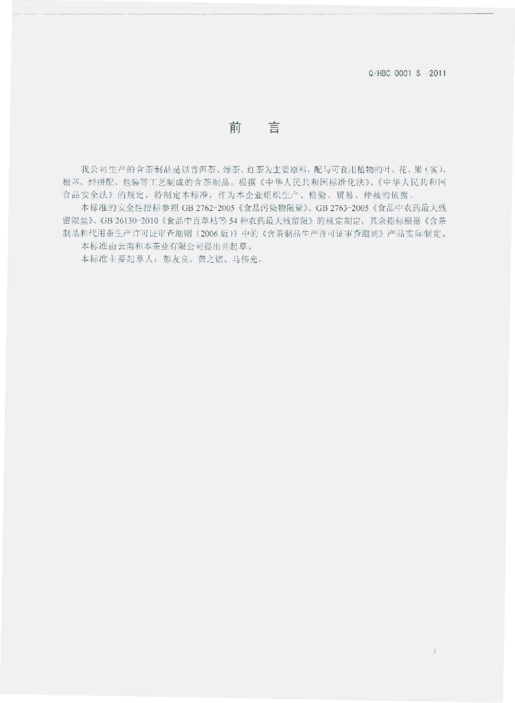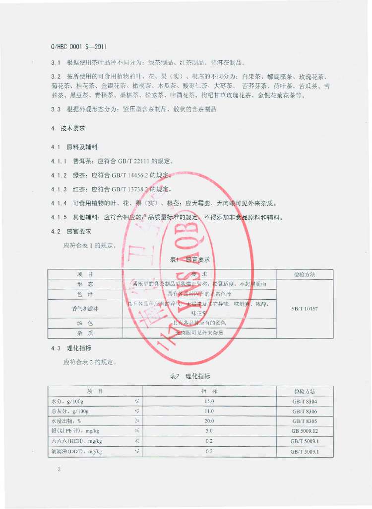 Q/HBC 0001S-2011 含茶制品