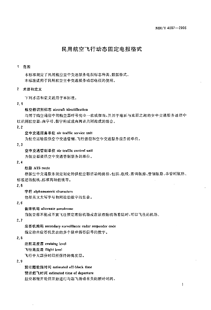 MH/T 4007-2006 民用航空飞行动态固定电报格式