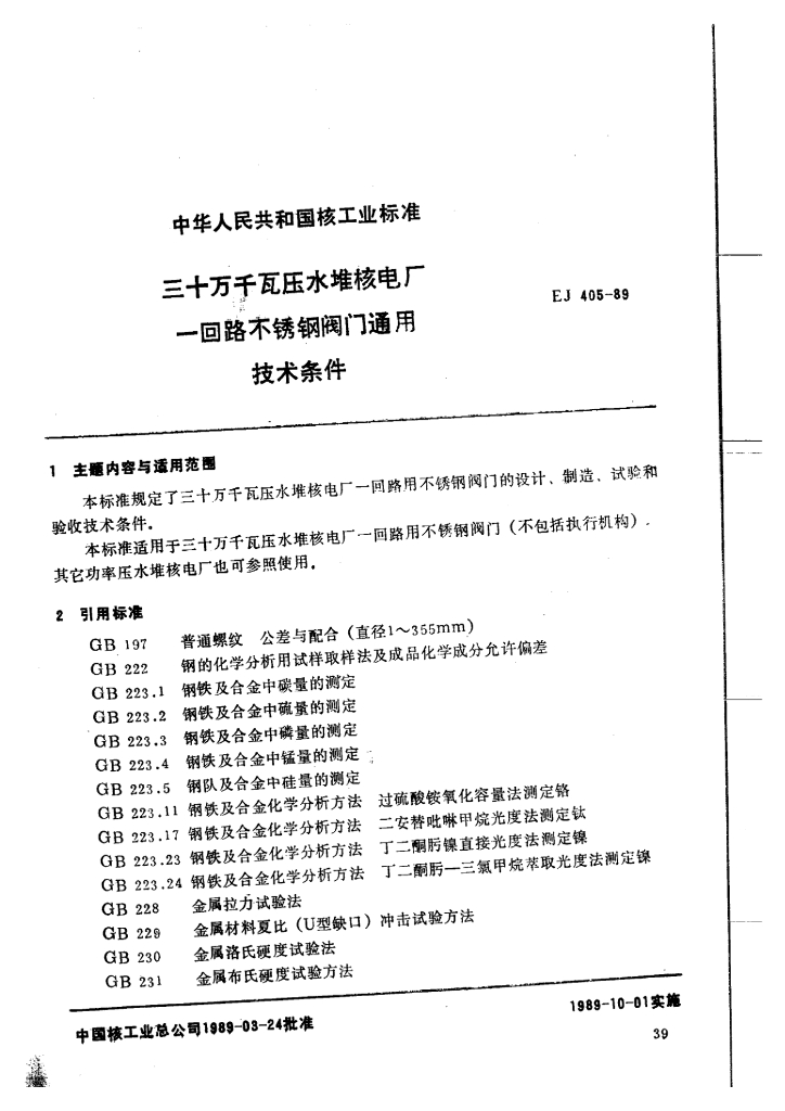 EJ/T 405-1989 三十万千瓦压水堆核电厂 一回路不锈钢阀门通用技术条件