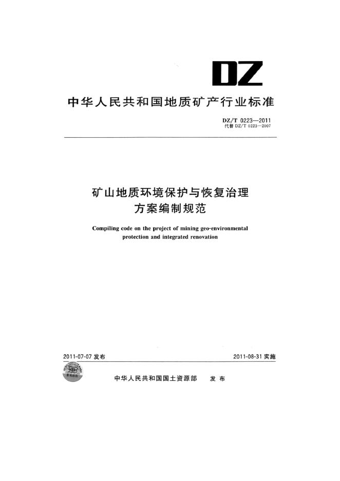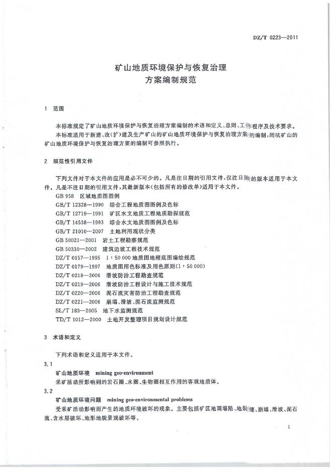 DZ/T 0223-2007 矿山环境保护与综合治理方案编制规范