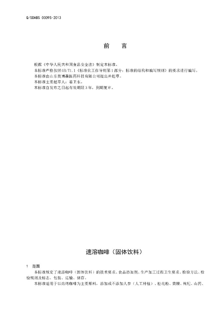 Q/SDABS 0009S-2013 山东奥博森医药科技有限公司 速溶咖啡(固体饮料)