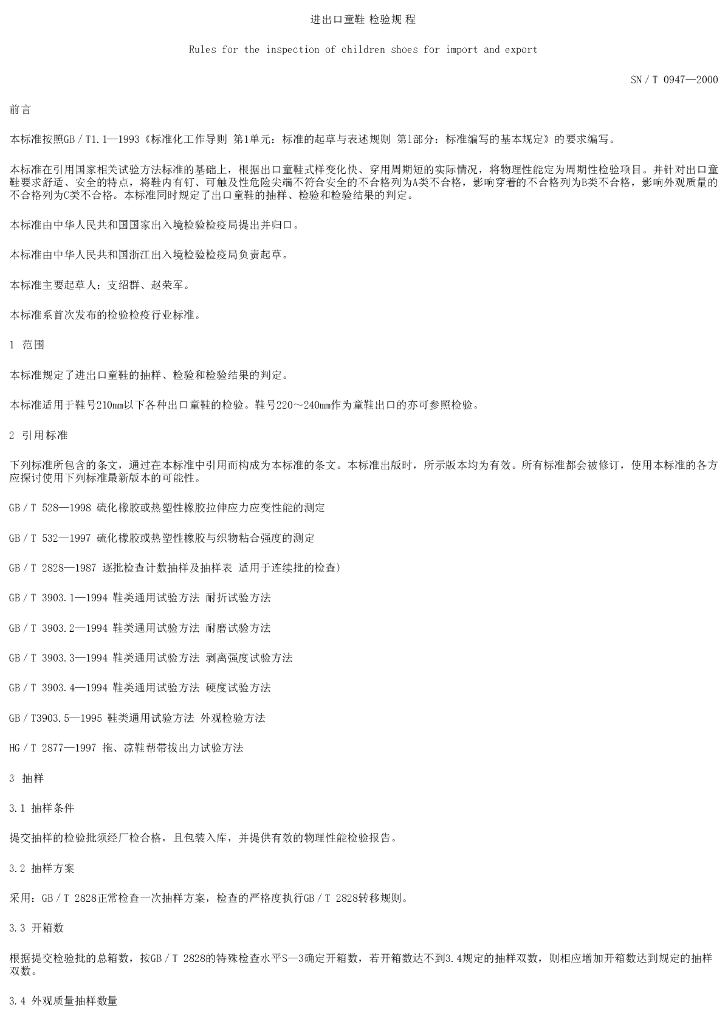 SN/T 0947-2000 进出口童鞋 检验规程