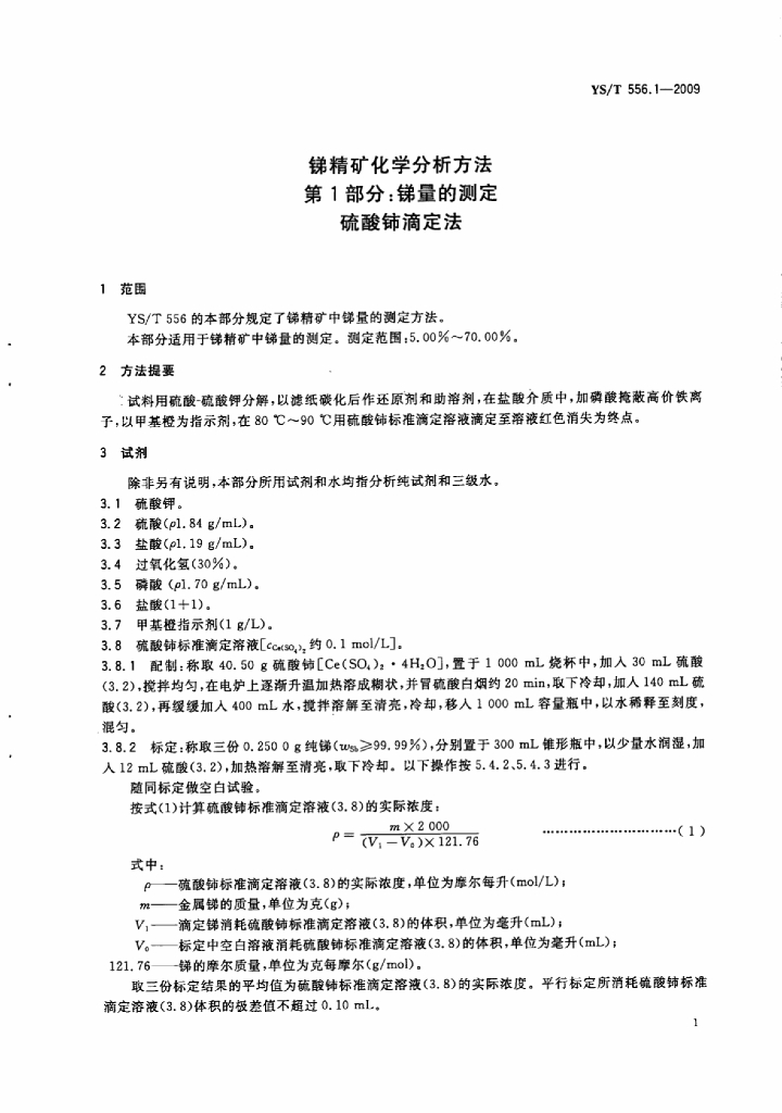 YS/T 556.1-2009 锑精矿化学分析方法 第1部分:锑量的测定 硫酸铈滴定法