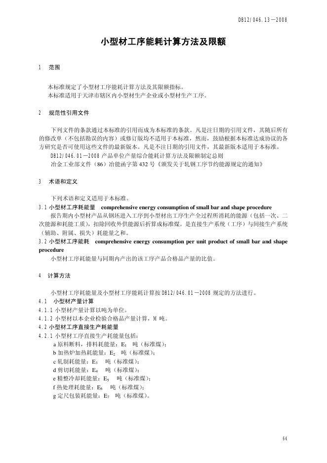 DB12/ 046.13-2008 小型材工序能耗计算方法及限额