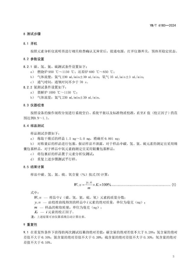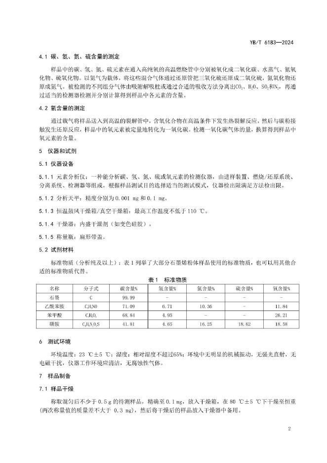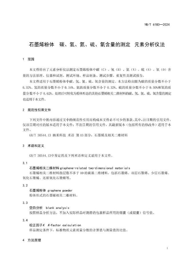 YB/T 6183-2024 石墨烯粉体 碳、氢、氮、硫、氧含量的测定 元素分析仪法