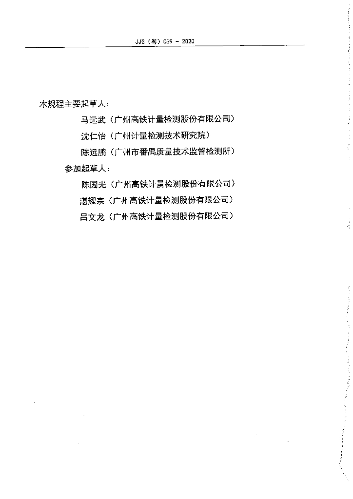 马远武(广州高铁计量检测股份有限公司)、沈仁怡(广州计量检测技术研究院)、陈远鹏(广州市番禺质量技术监督检测所)、陈国光(广州高铁计量检测股份有限公司)、湛耀宗(广州高铁计量检测股份有限公司)、吕文龙(广州高铁计量检测股份有限公司)
