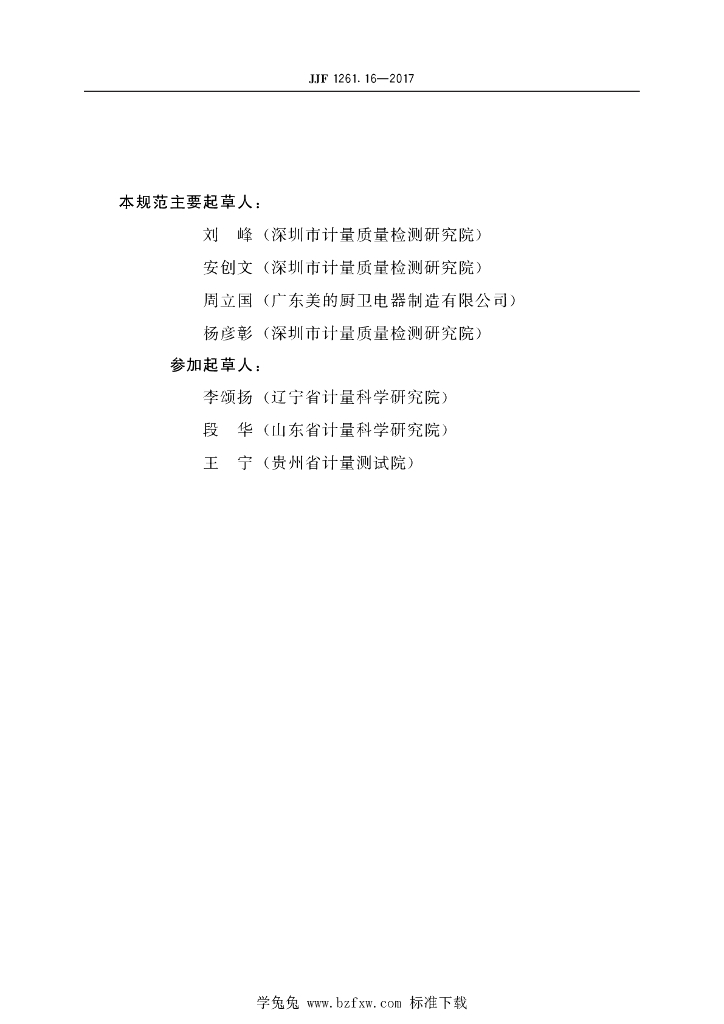 刘峰(深圳市计量质量检测研究院)、安创文(深圳市计量质量检测研究院)、周立国(广东美的厨卫电器制造有限公司)、李颂扬(辽宁省计量科学研究院)、段华(山东省计量科学研究院)、王宁(贵州省计量测试院)
