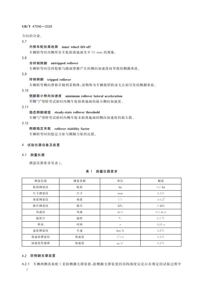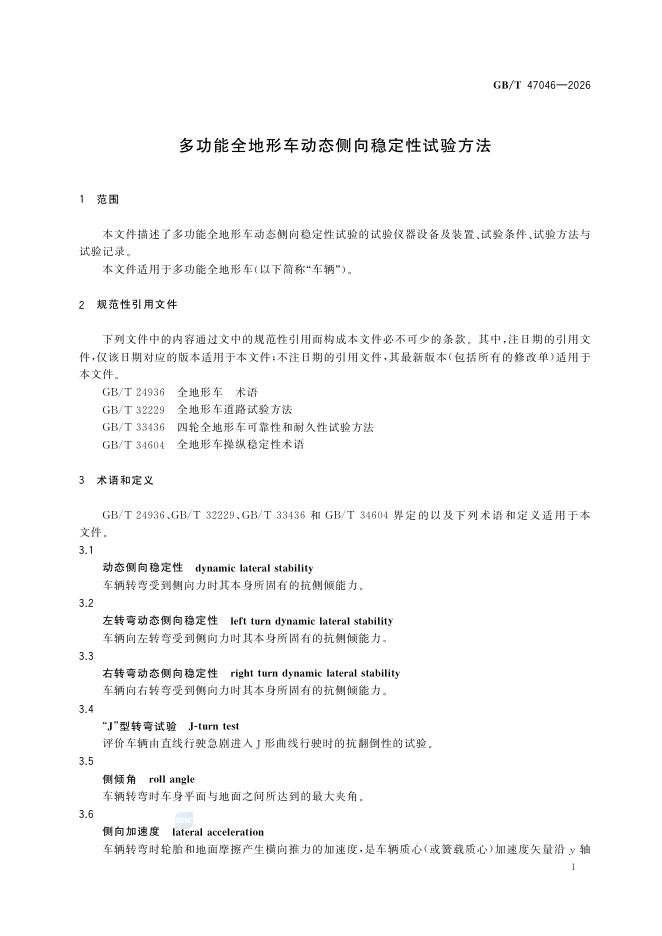 GB/T 47046-2026 多功能全地形车动态侧向稳定性试验方法