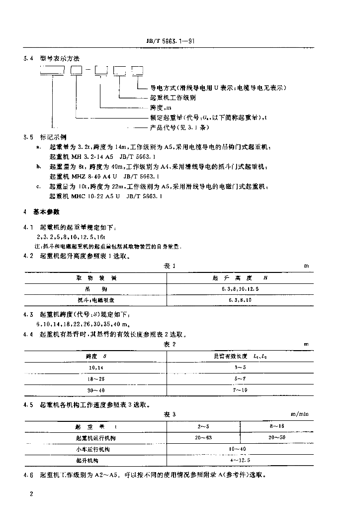 JB/T 5663.1-1991 电动葫芦门式起重机 型式与基本参数
