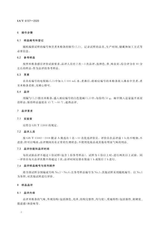 LS/T 6137-2020 米粉条食用品质感官评价方法
