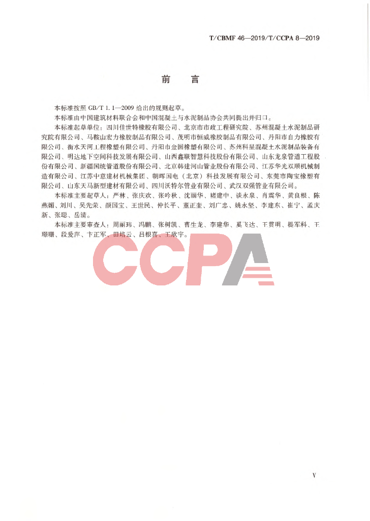 四川佳世特橡胶有限公司、北京市市政工程研究院、苏州混凝土水泥制品研究院有限公司、马鞍山宏力橡胶制品有限公司、茂明市恒威橡胶制品有限公司、丹阳市自力橡胶有限公司、衡水天河工程橡塑有限公司、丹阳市金圆橡塑有限公司、苏州科星混凝土水泥制品装备有限公司、明达地下空间科技发展有限公司、山西鑫联智慧科技股份有限公司、山东龙泉管道工程股份有限公司、新疆国统管道股份有限公司、北京韩建河山管业股份有限公司、江苏华光双顺机械制造有限公司、江苏中意建材机械集团、朝晖国电(北京)科技发展有限公司、东莞市陶宝橡塑有限公司、山东天马