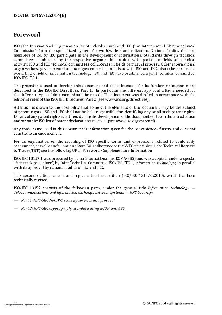ISO/IEC 13157-1-2014 信息技术 电信和系统间的信息交换 NFC安全 第1部分:NFC-SEC NFCIP-1的安全服务和协议